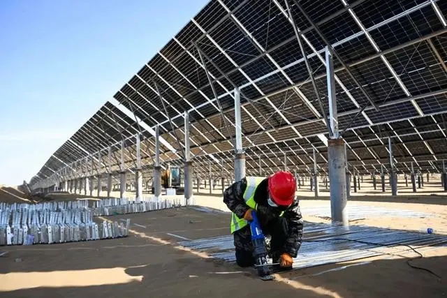 工人在內蒙古鄂爾多斯市達拉特旗光伏發電基地作業。