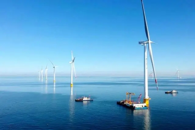 △在碧海藍天的萊州灣海域的昌邑海洋牧場與三峽300兆瓦海上風電融合試驗示范項目50臺6兆瓦風電機組。